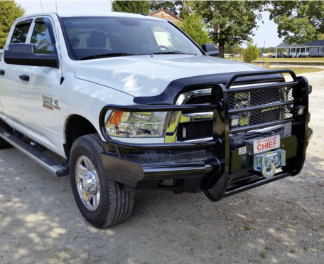Trusted by loggers, firefighters, linemen, oil field pipe-line welders, heavy equipment operators, park rangers, hunters, and many other hard working Americans. This bumper provides simple access to the winch when you need it most. The winch sits higher and the line on the winch drum is visible making it easier to focus on the task of winching. Full, clean welds are a staple throughout this bumper making it structurally stronger and more resistant to the elements. Thick expanded metal grille protection, 2" receiver beneath the winch mount, and fog light sleeves are standard on this bumper. Angled diamond plated steel lower provides maximized ground and tire clearance. The finish is achieved through a multi-step coating process which includes a primer base coat. The finish is gloss black powder coat that will compliment the color of nearly any truck. Frame mounted using existing bolt holes.