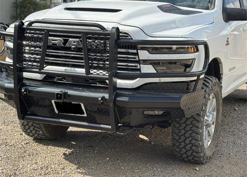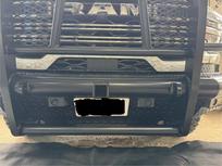 Built on a schedule 40, 4" front pipe base, this bumper retains the front parking sensors, tow hooks, the new style Ram rectangle LED fog lights, and camera. This bumper also has 3 bars around the headlights for added headlight protection. As with all full bumper replacements we offer it has a welded side gusset that provides added strength to the headlight loops. The finish is a black gloss powdercoat and approximate weight is 280 lbs.